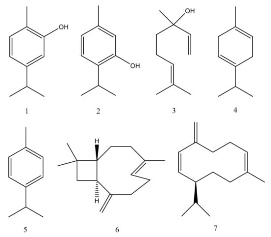 Chemical structures of main constituents of Origanum vulgare essential oil: (1) Carvacrol, (2) Thymol, (3) Linalool, (4) γ-Terpinene, (5) p-Cymene, (6) β-Caryophyllene, (7) Germacrene D.