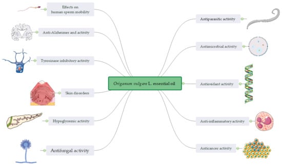 OEO particularly high in carvacrol and thymol represents an efficient alternative as antimicrobial agent against both Gram-positive and Gram-negative bacterial strains including multiresistant Gram-positive and Gram-negative bacteria S. aureus, E. coli, P. aeruginosa, K. pneumoniae. The antioxidant activity of OEO is attributed to the presence of the same compounds. OEO decreases the expression of pro-inflammatory cytokines and of inflammatory genes, due to the presence of carvacrol, emphasizing multiple mechanisms of action. The antitumor effects of OEO were reported for several types of cancer, including breast, colon, hepatic, or cervical cancer, with IC50 values ranging approximatively from 8 to 300 µg/mL.