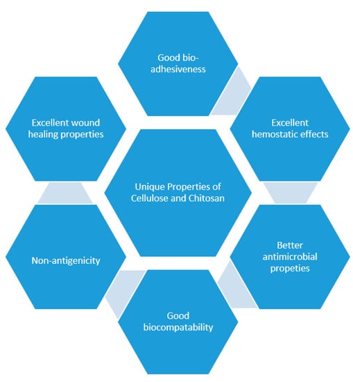 Wound dressing materials are formulated in various forms such as hydrogels [,,], films [,,,,], nanofibers [,], foams, topical formulations, wafers [], transdermal patches [,,], sponges [,,], and bandages [,,]. The limitations that are associated with some of the currently employed wound dressings include poor gaseous exchange between the wound and the surroundings, difficulty in the removal of the wound dressing, inability to protect the wound against microbial infection, poor mechanical properties, lack of sterility, induction of allergic reactions, poor absorption of wound exudates, and their inability to sustain a moist environment for accelerated wound healing []. Most of the aforementioned features that are lacking in some of the currently designed wound dressings are exhibited by hydrogels developed from biopolymers such as chitosan and cellulose. There are various interesting unique properties of chitosan and cellulose that are attractive for the development of wound dressings. The properties include excellent hemostatic capability and antibacterial effects, availability of various types of functional groups that can be used for their modification, bio-adhesiveness, highly biocompatible, and outstanding wound healing characteristics (Figure 1) []. Some of the biopolymers are not presenting these properties. Combining the aforementioned features with the properties of hydrogels can result in an effective wound care. This review article is focused on the in vitro and in vivo therapeutic outcomes and properties of hydrogels that were recently developed (2019–2020) from chitosan and its derivatives, and cellulose and its derivatives for wound management.