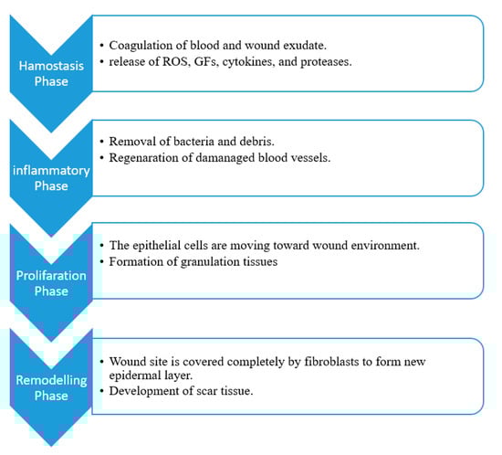 The wound healing process is a complex mechanism that leads to the repair of injured skin tissue. The phases of wound healing determine the type of wound dressing to be used for the proper management of the wound. The wound healing process is composed of four sequential phases that can overlap: hemostasis, inflammation, proliferation, and remodeling phase (Figure 2) []. The hemostasis phase takes place immediately after an injury, and this phase occurs rapidly. The blood vessel becomes narrow, restricting the blood flow. There is a platelet accumulation forming a clot that seals the ruptured wall of the blood vessel, thereby terminating the bleeding []. The inflammatory phase involves the cleansing of debris and bacteria removal by neutrophils, reactive oxygen species, and proteases which are released by phagocytic cells to provide a suitable environment for the healing process []. The hemostasis and inflammatory phase concurrently take place for 3 days []. The injured blood vessels produce transudate resulting in swelling. Inflammation is useful at this phase to prevent infection and control bleeding. However, prolonged inflammation can be problematic.