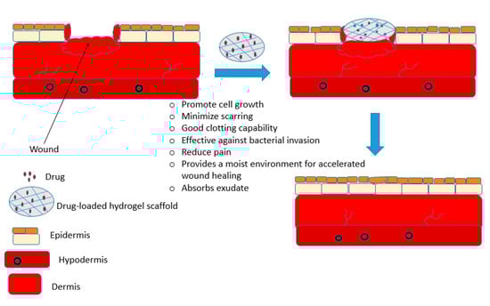 Although there are several interesting properties of hydrogels in the field of wound management, they also suffer from some limitations such as dehydration if they are not covered, result in skin maceration, they need a secondary dressing, it is not easy to secure them, and they possess poor mechanical stability at swollen state []. Other disadvantages of hydrogels are their ineffectiveness in wounds with excessive wound exudates, which may involve secondary wound dressings and they are not suitable scaffolds for moderate-to-extreme exudative wounds [].