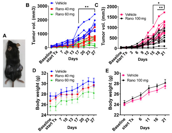 Systemic treatment with ranolazine decreases tumor growth in immune competent mice. (A) C57BL mice with syngeneic allografts of TRAMPC1 cells in both flanks. (B) Changes in tumor volume over time in mice bearing TRAMPC1 tumors and systemically treated orally with vehicle (PBS), 40 or 60 mg/kg 3 times a week of ranolazine over 4 weeks. Two-way ANOVA p = 0.001 (drug), ** p < 0.01, each treatment vs. vehicle; n = 7 for vehicle and 60 mg dose; n = 6 for 40 mg dose. (C) Same as in B but with 100 mg/kg over 3 weeks, repeated measures (RM)-ANOVA p = 0.017 (drug); * p = 0.03, ** p < 0.01 vs. vehicle, n = 10 per group. (D,E) Body weight of the mice (Mean ± SEM) over the course of the studies with 40 or 60 mg (D) or 100 mg (E).