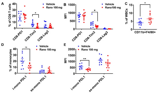 Treatment with ranolazine results in changes in immune check point proteins (ICP) and macrophages in the tumors. Tumors of treated mice (Figure 1C, 100 mg/kg) were collagenase-treated and used for flow analysis of ICP surface markers. (A,B) Mean fluorescence intensity (MFI) of PD1, Tim3, and Lag3 markers in exhausted CD4 (A) or CD8 (B) T-cells from treated tumors with 100 mg/kg ranolazine (vehicle, n = 9; rano n = 10), Mann–Whitney test; * p < 0.05. (C) Percentage of tumor macrophages in tumors treated with 100 mg/kg ranolazine; t-test; * p = 0.03. (D,E): Percentage (D) or MFI (E) of blood myeloid monocytes expressing PDL1 ligand in ranolazine-treated mice. Mann–Whitney test; ** p = 0.01. i-mono = inflammatory monocyte (likely immune suppressive); ss-mono = steady state monocytes.