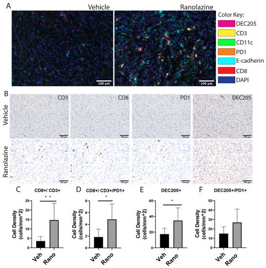 We next used multispectral fluorescence immunohistochemistry to localize and quantify immune cells in tumor sections [35]. Figure 3 shows multispectral fluorescence (Vectra 3) images obtained from the TRAMPC1 tumors, showing higher infiltration of CD8 cells into the tumors treated with ranolazine. Images showed the infiltration of the immune cells into the tumors, as well as their proximity to the TRAMPC1 tumor cells Figure 3A. Quantification of the images using the Inform software indicated that CD8+/CD3+ cells were increased by ~3-fold with the drug treatment compared to vehicle, Figure 3B,C. Interestingly, PD1 expression was also significantly increased by 2-fold in the drug-treated tumors compared to vehicle, Figure 3D. These staining results seem discrepant with the flow data, however, the ratio of CD8+PD1+ to CD8+ was 27% for the drug-treated tumors compared to 40% for the vehicle-treated tumors. Overall, PD1+ stain was not significantly changed between vehicle and drug treatment, Supplementary Figure S2. Another possibility is that there might be more focal pockets of T-cells being activated and expressing PD1 in the intact tumors compared to the overall flow cytometry analysis. Dendritic cells were also significantly increased in the drug-treated tumors compared to vehicle, Figure 3E, and this was not accompanied by increased PD1 expression (Figure 3F), suggesting that more active antigen presentation may be occurring in the drug-treated tumors.