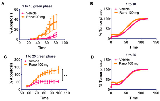 Increased ex vivo cell cytotoxic activity of drug-treated spleens; Cells from spleens of drug-treated mice were mixed with NucRed labeled TRAMPC1 cells at different ratios to assess the cytotoxic activity of the tumor cells, using a 96-well plate fluorescent caspase assay. (A) Percentage of apoptosis using a 1:10 ratio of TRAMPC1 to spleen cells. (B) Corresponding tumor phase to show growth of tumor cells with both conditions. (C,D) Same as in A but at 1:25 ratio. Two-way ANOVA: ** p = 0.0012 (42% difference in green counts between vehicle and ranolazine treatment). Data represents Mean + SEM; n = 10 per condition.