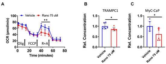 Mouse prostate cancer cells burn less lipid and generate less acyl-carnitines when exposed to ranolazine. (A) Decreased oxygen consumption rate (OCR) in TRAMPC1 cells treated with ranolazine and 25 µM of oleic acid conjugated to BSA for 2 h prior to the assay. The significant section of increased OCR corresponds to the maximal respiration after addition of FCCP. Holm–Sidak multiple comparisons t-test: ** p < 0.001 vs. vehicle. Olig = oligomycin; R + A = rotenone + antimycin A. (B,C) Decreased acyl-carnitine production after treatment with 75 µM ranolazine for 24 h in TRAMPC1 (B) and MycCaP (C) cells, t-test: * p < 0.05 vs. vehicle.