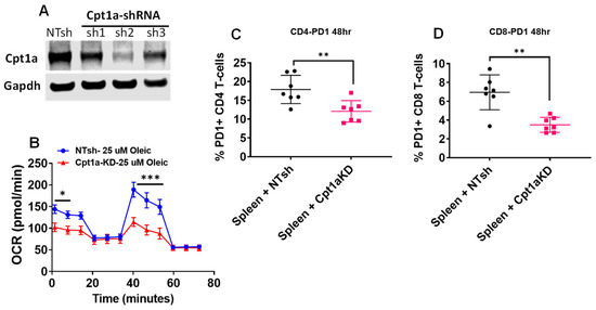 To study the role of Cpt1A and lipid oxidation in immune cells, we used a lentivirus approach to knock down (KD) Cpt1A expression in the TRAMPC1 cells. We used three different shRNAs and selected sh2 to proceed with the experiments, as it produced the best KD results, Figure 6A. This selected Cpt1a-KD cell line was able to decrease basal (50%) and maximal respiration measurements when the cells were challenged with 25 µM oleic acid in a seahorse oxygen consumption rate (OCR) assay, Figure 6B. Next, we studied the effect of co-culturing the Cpt1a-KD cells with isolated spleen cells from seven mice (four male + three female), Figure 6C,D. A decrease in the percentage of CD4+ T-cells expressing PD1 and CD8+ T-cells expressing PD1 was observed when the exhausted spleen cells were incubated with the Cpt1a-KD cells compared to the control cells (NTsh cell line). These changes were not associated with decreased viability of the T-cells, supplementary Figure S3. These data indicated that genetically blocking the ability of the tumor cells to burn lipid can change the activation status of the neighboring T-cells.