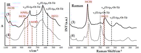 Analysis of the electrospray ionization-mass spectrometry (ESI-MS) spectra of (1) and (2) confirm the presence of peaks, which can be assigned to the fragmentation ions containing {Ti3-(μ3-O)} cores (Table 3). Considering these data, we can state that the trinuclear oxo-Ti(IV) complexes, i.e., [Ti3O(OiPr)8(O2C-4-PhNH2)2] (1) and [Ti3O(OiPr)8(O2C-4-PhOH)2] (2) were isolated from the 4:1 reaction mixture of Ti(OiPr)4 and HO2CR’; R’ = 4-PhNH2 and 4-PhOH using the tetrahydrofuran (THF)/PriOH (1:1 mixture) as a solvent. The bands, which were detected at 702 and 703 cm−1 and 687 and 690 cm−1 in the IR and Raman spectra of (3) and (4), were attributed to stretching modes of Ti4(μ4-O) bridges, whereas bands at 634–639 cm−1 and 532–556 cm−1 (IR) and 687–690 cm−1 and 536–548 cm−1 (Raman) were assigned to vibrations of Ti4-(μ-O) bridges of {Ti4O2} cores (Figure 2 and Table 2). Additionally, in these cases, the presence of peaks attributed to fragmentation ions containing {Ti4O2} cores in MS spectra of (3) and (4) confirms the tetranuclear structures of these complexes (Table 2). The results obtained indicate the isolation of the tetranuclear Ti(IV) oxo-complexes [Ti4O2(OiBu)10(O2C-4-PhNH2)2] (3) and [Ti4O2(OiBu)10(O2C-4-PhOH)2] (4) from the mother liquor composed of a 4:1 mixture of Ti(OiBu)4 and the above-mentioned organic acids and a 1:1 mixture of THF and BuiOH as a solvent.