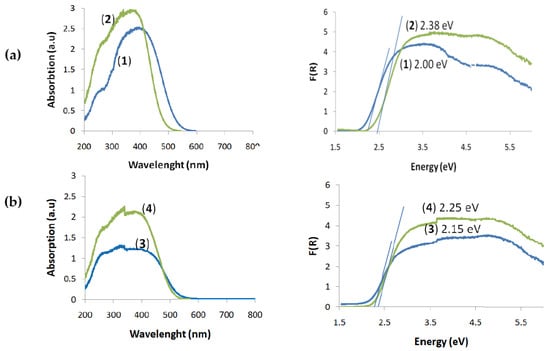 Solid-state UV-Vis-diffuse reflectance spectra (DRS) of the (1)–(4) micro-grains (the left side) and Kubelka-Munk function versus light energy plot for the HOMO-LUMO gap determination (the right side): (a) [Ti3O(OiPr)8(O2CC6H4NH2)2] (1) and [Ti3O(OiPr)8(O2CC6H4OH)2] (2) and (b) [Ti4O2(OiBu)10(O2CC6H4NH2)2] (3) and [Ti4O2(OiBu)10(O2CC6H4OH)2] (4).