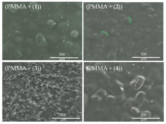 The photocatalytic properties of the (1)–(4) titanium(IV) oxo-complexes (TOCs) and their antimicrobial activity were estimated using (PMMA + TOC) composite foils produced by the dispersion of 20 wt.% TOC micro-grains in the PMMA matrix [21,22]. SEM images, presented in Figure 4, show that composite foils (PMMA + (1), (2), and (4)) contain the dispersed TOC grains of diameters 100–300 μm. In the case of (PMMA + (3)), fine grains (of diameters 3–5 μm) of the oxo-complex that may form larger aggregates are dispersed in the polymer matrix. The registration of Raman microscopy maps allowed to investigate the TOC grain presence and distribution in the PMMA matrix (Figure 5).