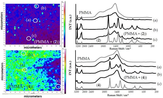 Raman microscopy maps, registered for PMMA + TOC composites (TOCs (2) and (4)). The Raman spectra, in selected points (a)–(c) on the surface of PMMA + TOCs, are presented alongside.