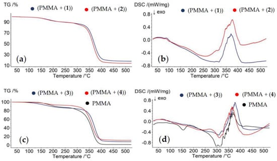 Thermogravimetric curves (TGA) (a,c) and the differential scanning calorimetry curves of (DSC) (b,d) of the produced composite materials (PMMA + (1)–(4)) and PMMA.