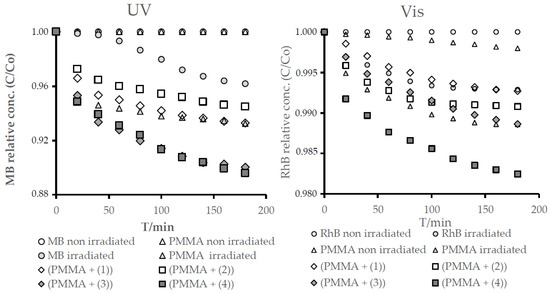 The photocatalytic activity of PMMA + TOCs foils (TOCs = (1)–(4)) was studied by monitoring the degradation processes of MB aqueous solution according to ISO 10678:2010 procedure and, also, Rhodamine B (RhB) solution [38,39,40]. Foil samples of sizes 10 × 10 mm were preconditioned by exposure to UVA or Vis light for 30 h. In the next step, foils were placed in quartz cuvettes with both dye solutions (V = 3.5 cm3 and C = 2.0 × 10−5 M). After 12 h in the dark, the solutions were replaced by the appropriate test of MB and RhB solutions (for both: V = 3.5 cm3 and C = 1.0 × 10−5 M). The prepared samples were exposed to UVA irradiation (18-W lamp, 340–410-nm range, with a maximum at 365 nm) and Vis light (77-W tungsten halogen lamp, range of 350–2200 nm). All cuvettes were covered with quartz glass panes during irradiation. MB absorbance at 660 nm and RhB absorbance at 554 nm were registered (Metertech SP-830 PLUS, Metertech, Inc., Taipei, Taiwan) after 0, 20, 40, 60, 80, 100, 120, 140, 160, and 180 min of irradiation. Percentage of MB decolorization was calculated using the equation