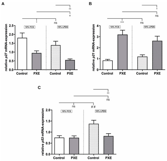 Relative p27, p21 und p53 mRNA-expression of PXE fibroblasts and NHDF. Fibroblasts were cultivated for 24 h in medium with 10% FCS or 10% LPDS. (A) Relative p27 mRNA-expression of PXE fibroblasts (gray, n = 3) and NHDF (white, n = 3). (B) Relative p21 mRNA-expression of PXE fibroblasts (gray, n = 3) and NHDF (white, n = 3). (C) Relative p53 mRNA-expression of PXE fibroblasts (gray, n = 3) and NHDF (white, n = 3). Data are shown as mean ± SEM. Control/ PXE: * p ≤ 0.05; ** p ≤ 0.01; *** p ≤ 0.001; ns p > 0.05. 10% FCS/ 10% LPDS: + p ≤ 0.05; ## p ≤ 0.01; ns p > 0.05.