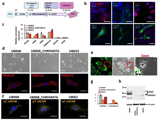 UB068 (CHRFAM7A null), UB068_CHRFAM7A (isogenic CHRFAM7A carrier), and UB052 (nascent CHRFAM7A carrier) were differentiated into MGL cells through yolk sac embryoid bodies (YS-EBs) in a chemically defined medium that was supplemented with colony-stimulating factor (CSF1) and interleukin IL-34 (Figure 1a). The YS-EBs demonstrated VE-cadherin and c-Kit expression (Figure 1b, upper row), signifying early YS myelogenesis [28], and transcription factor PU.1, which drives microglial differentiation and maintenance [29,30]. Pooled and plated MGL progenitors were positive for surface markers CD11b, CD68, and intracellular calcium-binding protein Iba-1 (Figure 1b, lower row). The MGL cells differentiated from the three iPSC lines expressed microglia-specific markers (Figure 1c) and demonstrated a characteristic morphology (Figure 1d, upper row) and a positive stain with microglia-specific transmembrane protein TMEM119 (Figure 1d, lower row). The functional activity of the MGL cells was demonstrated via phagocytic activity using fluorescent latex beads (Figure 1e).