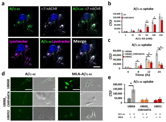 CHRFAM7A mitigated the α7-nAChR-dependent Aβ1–42 uptake: (a) Confocal microscopy images demonstrated the localization of Aβ1–42 (green), LysoTracker Deep Red (magenta), and α7 nAChR (grey) in MGL cells derived from the UB068 line. Nuclei were stained with DAPI (blue). The uptake of Aβ1–42 co-occurs with LysoTracker and α7 nAChR. Scale bar, 10 µm. Cells were incubated with Aβ1–42 (100 nM) for 24 h, then washed and incubated with LysoTracker for 5 h (n = 5; three independent cultures). (b) Transfection of the MGL cells derived from UB068 line (0 copy) with CHRFAM7A mitigated the Aβ1–42 uptake in a dose-dependent manner. Quantification is presented as the corrected total cell fluorescence (CTCF) using ImageJ. Data are presented as mean ± SD. * p < 0.05 (t-test)—comparison between the Aβ1–42 uptake in CHRFAM7A and EV-transfected cells (50 cells measured from 5 fields; 4 independent cultures; quantification was performed by two blinded raters; n = 5; 3 independent cultures). (c) Time course of the Aβ1–42 uptake (100 nM) by MGL cells that were derived from iPSC lines (UB068, UB068_CHRFAM7A, and UB052). Data are presented as mean ± SD. * p < 0.05 (t-test)—comparison between UB068 and carrier UB068_CHRFAM7A and UB052 lines at each given time point. (d) Representative images of MGL cells derived from the three lines and treated with MLA (10 µM), followed by treatment with Aβ1–42 (100 nM) for 18 h (n = 5; three independent cultures). (e) Pretreatment with MLA (10 µM) increased the Aβ1–42 (100 nM) uptake in UB068, but not in CHRFAM7A carrier cell lines. Data are presented as mean ± SD. * p < 0.05 (t-test)—difference between the Aβ1–42 uptake in MGL cells that were pre-treated with MLA in comparison to no pretreatment (n = 5; three independent cultures).