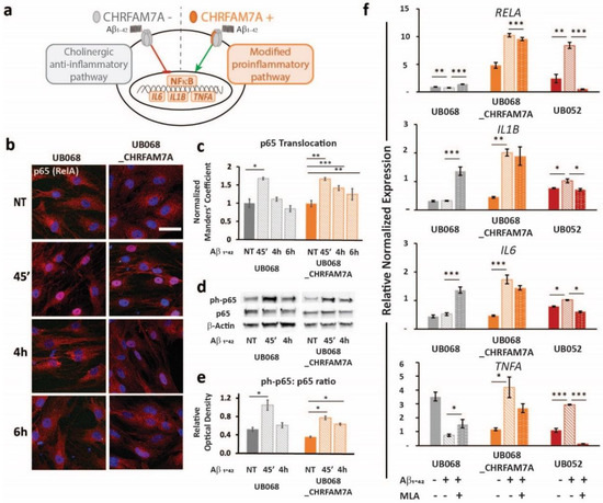Immune surveillance of DAMP: CHRFAM7A facilitated microglia activation: (a) Schematic of the proposed model indicating that CHRFAM7A harboring hypomorphic α7 nAChR released NF-κB inhibition, and as a result, triggered an inflammatory response. (b) Representative confocal images demonstrated p65 (RelA) staining during the time course of the Aβ1–42 (1 μM) treatment in MGL cells derived from the UB068 (left panel) and UB068_CHRFAM7A (right panel) lines (n = 5). Scale bar, 20 µM. (c) NF-κB translocation dynamics upon the Aβ1–42 treatment up to 6 h using the operator-independent Manders’ coefficient (5 images, at least 100 cells/image) in the UB068 and UB068_CHRFAM7A lines. Data are presented as mean ± SD. * p < 0.05, ** p < 0.01, *** p < 0.001 (t-test) - difference in the Aβ1–42-induced inflammatory response in comparison to the non-treated controls. (d) Representative immunoblots showed an increase in the p65 (RelA) phosphorylation in response to the Aβ1–42 treatment in MGL cells derived from the carrier and non-carrier lines. (e) Densitometric analysis of the phospho-p65 (Cell Signaling Technology, Cat# 3033) and p65 expression levels in untreated and Aβ1–42-treated (1 μM; 45′, 4 h) MGL cells. Data are presented as mean ± SD. * p < 0.05 (t-test)—difference in Aβ1–42-induced inflammatory response in comparison to the non-treated controls (n = 5). (f) Gene expression of the NF-κB targets RELA (top row), IL1B (second row), IL6 (third row), and TNFA (bottom row) in response to the Aβ1–42 treatment in the UB068, UB068_CHRFAM7A, and UB052 lines. Pretreatment with an α7nAChR-specific antagonist MLA (10 µM) decreased RELA, IL1B, IL6, and TNFA expression levels in the CHRFAM7A carrier lines, but increased them in UB068. Data are presented as mean ± SE. * p < 0.05, ** p < 0.01, *** p < 0.001 (t-test)—difference in the Aβ1–42-induced gene expression levels compared to non-treated controls in the presence and absence of MLA in the three cell lines (n = 5).