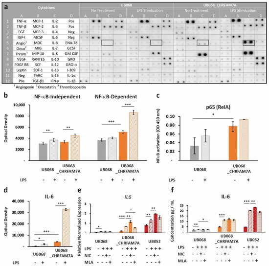Next, we explored whether the proinflammatory switch mechanism applies to other molecular patterns that do not directly bind the α7 nAChR. We selected LPS as a prototype PAMP that interacts with the TLR4 receptor, and at the same time, converges on NF-κB-mediated immune activation. Upon LPS stimulation, we again detected a differential response in the CHRFAM7A carrier (UB068_CHRFAM7A and UB052) and non-carrier (UB068) lines. Human Cytokine Antibody Array (Abcam, Cambridge, U.K.) as a screen for cytokine activation in the non-carrier (UB068) and isogenic carrier line (UB068_CHRFAM7A) (Figure 4a) revealed a higher expression level of NF-κB-dependent cytokines in the isogenic carrier (UB068_CHRFAM7A) line at baseline (Figure 4b). The non-carrier (UB068) line demonstrated NF-κB-dependent and NF-κB-independent immune responses to LPS. The isogenic carrier line (UB068_CHRFAM7A) demonstrated a shift toward an NF-κB-dependent cytokine response after the LPS treatment (Figure 4b). An NF-κB DNA binding assay correlated with both the baseline and LPS-induced NF-κB-dependent cytokine response (Figure 4c). Multiple-testing-corrected differences were detected for IL-8, IL-6, MCP-1 (CCL2), GCSF, MDC (CCL22), GRO-α (CXCL1), ENA-78 (CXCL5), TNF-β, TNF-α, and IL-10 at baseline (Supplementary Figure S1). The cytokine response to LPS included GRO-α (CXCL1), IL-8, and MCP-1 (CCL2) in the non-carrier (UB068) (Supplementary Figure S1). In the isogenic carrier line (UB068_CHRFAM7A), IL-6, GRO-α (CXCL1), TNF-β, IL-8, IL-10, and ENA-78 (CXCL5) showed a significant response to LPS (Supplementary Figure S1). IL-6, IL-8, and MCP-1 (CCL2) emerged as drivers of the NF-κB-mediated effect at baseline and upon LPS stimulation after multiple testing corrections (Supplementary Figure S1, Figure 4d). IL-6 transcriptional (qPCR) (Figure 4e) and cytokine responses (ELISA) (Figure 4f) were validated in the non-carrier (UB068), engineered isogenic (UB068_CHRFAM7A), and nascent carrier (UB052) lines. In the carrier line, nicotine, an α7 nAChR agonist, increased the LPS response by facilitating the proinflammatory effect of CHRFAM7A-modified α7 nAChR (Figure 4e,f). MLA, an α7 nAChR antagonist, had a minimal effect on the inflammatory response as the active process inhibition was already released by the hypomorphic receptor. In contrast, in the non-carrier line (UB068), nicotine facilitated the anti-inflammatory effect and MLA released it (Figure 4e,f). The IL-1β response was below the detection threshold in the cytokine screen but was detected with RT-qPCR and ELISA (Supplementary Figure S2).