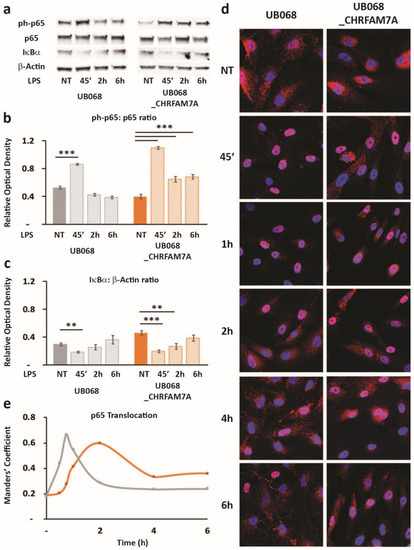 Hypomorphic CHRFAM7A caused NF-κB inhibition, resulting in a proinflammatory switch: (a) Immunoblots showed an increase in p65 (RelA) phosphorylation and a decrease in IκBα in response to the LPS treatment (1 μg/mL) in the UB068 and UB068_CHRFAM7A lines. Densitometric analysis of the phospho-p65 (Cell Signaling Technology, Cat# 3033) and p65 (b) and IκBα (c) expression levels in the untreated and LPS-treated (1 μg/mL; 45′, 2 h, 6 h) MGL cells derived from the UB068 and UB068_CHRFAM7A lines. Data are presented as mean ± SD. ** p < 0.01, *** p < 0.001 (t-test)—difference in the LPS-induced inflammatory response in comparison to non-treated controls (n = 5). (d) Representative confocal images that demonstrate the p65 (RelA) staining during the time course of the LPS treatment in the MGL cells derived from the UB068 (left panel) and UB068_CHRFAM7A (right panel) lines (n = 5). (e) NF-κB translocation dynamics upon the LPS treatment up to 6 h using the operator-independent Manders’ coefficient (5 images, at least 100 cells/image) in the UB068 and UB068_CHRFAM7A lines.
