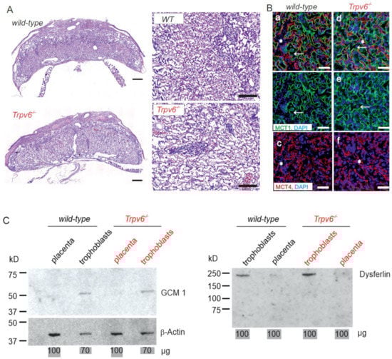 The Trpv6-/- placental labyrinth structure is less compact. (A) Hematoxylin–eosin staining of murine wild-type and Trpv6-/- placenta sections (left) and two enlarged sections from two other placentae of the labyrinth zone (right) at E14.5 are shown. Scale bar: placenta (left), 500 µm; labyrinth zone (right), 200 µm. (B) Immunostaining of the placental labyrinth zone from wt and Trpv6-/- at E14.5 with antibodies against monocarboxylate transporters 1 and 4 (MCT1, MCT4), the marker proteins of syncytiotrophoblast layers 1 and 2, respectively. The immunoreactivity for MCT1 (green signal) was detected in syncytiotrophoblast I cell layer which faced the maternal blood sinuses (arrow) and for MCT4 (red signal) in syncytiotrophoblast II cells which faced the fetal blood vessels (*), blue, DAPI stain, scale bar = 50 µm. (C) Western blot of protein lysates from 100 µg placenta and 70 µg trophoblast were tested for the presence of the trophoblast marker chorion-specific transcription factor GCMa (GCM1) and dysferlin. Antibody against beta-actin was used as loading control.