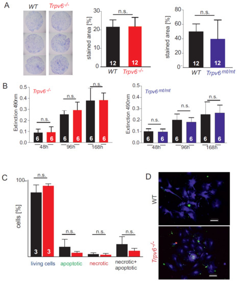 Cell viability and migration behavior of trophoblasts do not depend on the Trpv6 genotype. (A–D), wt, Trpv6-/,- and Trpv6mt/mt were isolated from placentae. (A) left side: bright field pictures from the bottom side of transwell membranes (8 µm pores) stained with eosin/azur to visualize migrated trophoblast cells after 48-h incubation. Middle and right side: data are presented as % of stained area + SD (n = 12 for each genotype, respectively) for Trpv6-/- (red) and Trpv6mt/mt (blue) as compared to wt (black). (B) Quantitative measurement of cell viability over 7 days shown as the formazan extinction (at 490 nm). The cell activity of three independent preparations was measured in wild-type trophoblasts (black) and Trpv6-/- (red) and Trpv6mt/mt (blue) trophoblast cells on days 2, 4, and 7 after isolation (number of dishes, n = 6). (C) Recording of % living (blue), apoptotic (green), and necrotic (red) cells in comparison of wild-type and Trpv6-/- trophoblasts (n = 3 independent cell isolations, 28 and 18 microscopic pictures from wt and Trpv6-/- trophoblasts were analyzed, respectively). (D) Microscopic picture of living (blue), apoptotic (green), and necrotic (red) cells stained after 72 h in culture, scale bar = 100 µm. (A–C) The significance of the differences between groups was calculated using Student’s t-test (not significant ((n.s.).