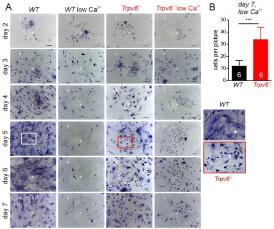 Primary cell culture of wt and Trpv6-/- trophoblasts (E14.5). (A) Wild-type and Trpv6-/- trophoblasts (200,000 per dish) were cultured with medium in the presence of 1.5 mM calcium. At day 2 of cell culture the calcium concentration was reduced to 0.1 mM free calcium concentration (wt low Ca2+, Trpv6-/- low Ca2+). Cells in normal or reduced calcium were cultured over seven days. Cells were fixed and stained with eosin/azur stained. Scale bar: 100 µm. Insets (red: Trpv6-/-, white: wt) of stained trophoblast cells in culture at day 5. (B) After 7 days, cells cultured in low calcium medium were fixed, stained with eosin/azur and adherent cells were counted (n = 6 pictures from N = 2 independent preparations). The significance of the differences between wt and Trpv6-/- was calculated using Student’s t-test (*** p < 0.001), Results are shown as mean + SD.