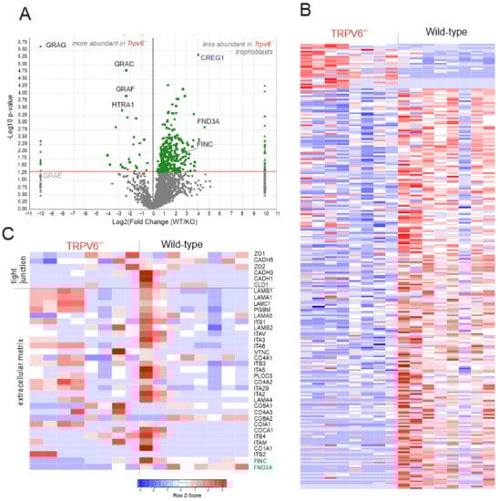 Proteome analysis of wt and Trpv6-/- trophoblasts. (A) Vulcano-blot-reporting semi-quantitative analysis of differentially-expressed proteins identified by mass spectrometry in wild-type and Trpv6-/- trophoblast lysates. Shown are 35 proteins upregulated and 314 proteins down-regulated in Trpv6-/- compared to wild-type controls. Up- and down-regulated proteins were identified based on at least 2-fold changes in the exponentially-modified protein abundance index (emPAI) values with a p-value < 0.05, calculated using the unpaired two-tailed Student’s t-test. Proteins identified on the very left or the very right side of the blot (−10,10) were exclusively detected in Trpv6-/- and wt trophoblasts, respectively. Fibronectin-domain-containing protein 3A (FND3A) and fibronectin (FINC) (green) and CREG1 (blue) were significantly more abundant in wt lysates. (B) Heatmap shows the Z-scores of the emPAI values from independent mass spectrometry measurements from eight independent wild-type and Trpv6-/- samples. (C) Heatmap shows Z-scores for emPAI values of identified proteins detected in the gene ontology terms tight junctions and extracellular matrix/assembly. Fibronectin-domain-containing protein 3A (FND3A) and fibronectin (FINC) (green) were significantly more abundant in wt lysates.