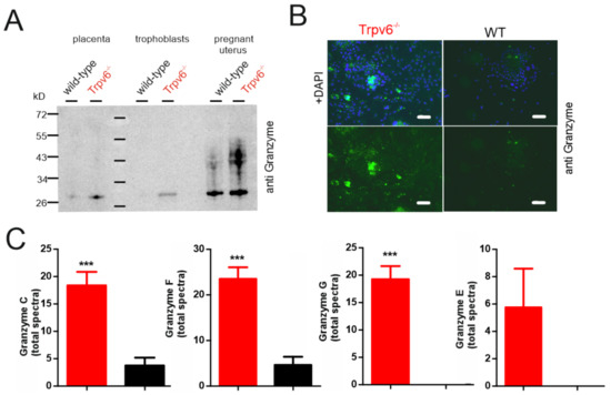 Granzymes are more abundantly expressed in Trpv6-/- trophoblasts. (A) Western blot of protein lysates obtained at day of preparation (day1) from placentae, trophoblasts and pregnant uteri were tested for the presence of granzymes. Equal amounts of proteins, as determined by bicinchoninic acid (BCA) assay were loaded. (B) Detection of granzymes in trophoblast cells at day 3 of cell culture, bar = 100 µm. (C) MS/MS-identified spectra of different granzyme isoforms identified in wild-type and Trpv6-deficient trophoblasts (n = 8 lysates/genotype). The significance difference between the groups was calculated using Student’s t-test (*** p < 0.001).