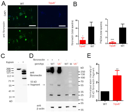 During the proteome analysis we identified fewer fibronectin spectra in Trpv6-/- trophoblast lysates. Likewise, minor fibronectin could be detected with fibronectin antibody staining in Trpv6-/- trophoblast cells when they were cultured for three days (Figure 6A). Finally, we tested, in protease activity assays, whether there is a causal link between increased amounts of proteases and decreased fibronectin in Trpv6-/- trophoblasts. As a proof of principle, we first incubated fibronectin in the presence of the serine protease trypsin and visualized fibronectin fragments by Western blot. As shown in Figure 6C, fibronectin (MW 273 kD) was cleaved by trypsin under the given conditions into smaller fragments. Next, we incubated fibronectin with lysates from wild-type or Trpv6-deficient placentae and visualized fibronectin fragments by Western blot (Figure 6D,E). A smaller 55 kD fibronectin fragment was also detectable in higher amounts when fibronectin was incubated with the Trpv6-deficient lysates. This suggests that the Trpv6-deficient placentae have a higher intrinsic proteolytic activity. At the same time these results correlate with the mass spectrometry results, where more proteases and less fibronectin were detected in Trpv6-/- trophoblasts (Figure 4, Figure 5, and Figure 6A,B).
