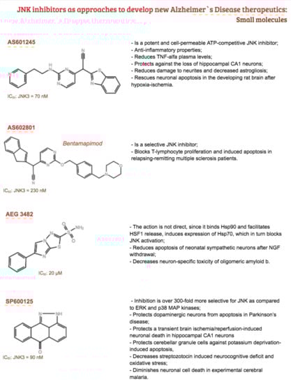 Summary of small molecules of JNK inhibitors used in neurological models that could be used as approaches to develop new Alzheimer’s disease (AD) therapeutics [157,185,186,187,188,189,190,191,192,213,214,215,216,217].