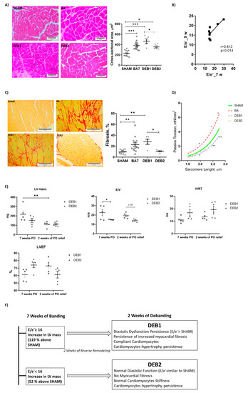 In agreement with our results, several studies reported that cellular and ECM myocardial changes regress at different rates. In general, myocardial hypertrophy regresses much faster than fibrosis, explaining the incomplete recovery of diastolic dysfunction even when LV mass regress [37,38]. In our study and compared to DEB2 and SHAM group, DEB1 displays a more adverse phenotype imposing an incomplete recovery of diastolic function, as supported by several studies with AVR [39,40]. Notably, after seven weeks of pressure-overload, diastolic dysfunction was more pronounced in DEB1 than in DEB2, as assessed by the higher E/e’. Based on reports from AS patients one year after AVR, the DEB1 phenotype is possibly explained by the existence of replacement fibrosis at debanding time, while DEB2 by a more diffuse pattern of fibrosis accompanied by myocardial function improvement [3]. Intrinsic cardiomyocyte changes also contribute to myocardial remodelling and diastolic dysfunction [41]. After debanding, we observed a normalization of passive tension in cardiomyocytes from both debanding subgroups, suggesting that myocardial fibrosis is the principal contributor for diastolic function impairment predominantly observed in DEB1. Accordingly, we also found a partial regression of cardiomyocytes stiffness and no regression of fibrosis in a similar rat experimental study [36]. In the context of the present study, reduction of cardiomyocyte stiffness can be interpreted as a compensatory response to pressure-overload relief of the “fibrotic” myocardium of the DEB1 subgroup, as previously reported in myocardium from HF patients [42].
