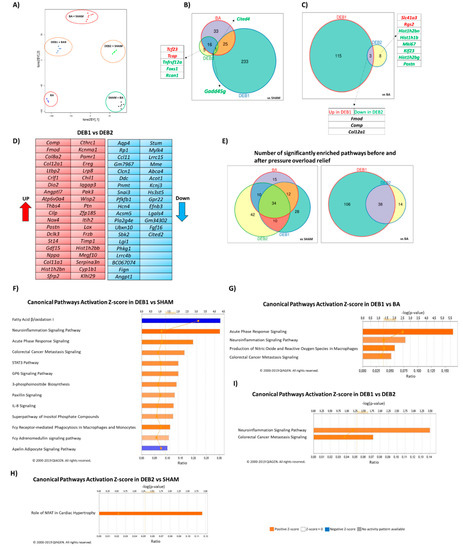 Two-dimensional t-SNEi projection of all initial LV samples (SHAM, BA, and DEB subgroups) and samples from animals with nine weeks of banding (Table S1) (A). Differentially expressed transcripts in BA, DEB1, and DEB2 groups when compared to SHAM (B), in DEB1 and DEB2 when compared to BA group (C), and the top expressed transcripts between the two debanding subgroups (D). When the number of differentially expressed transcripts was superior to 15, we referred to it in supplementary data as an excel file format (Data S1). The cut-off for differentially expressed transcripts was set for a false discovery rate (FDR) of ≤0.05, using Benjamini-Hochberg calculation, and a Log2FC ≤ −1 (blue transcripts) or Log2FC ≥ 1 (red transcripts). Venn diagram displaying the number of common and exclusive pathways between the four groups (E). Canonical pathways activation Z-score analysis in DEB1 vs. SHAM (F), DEB1 vs. BA (G), DEB2 vs. SHAM (H), and DEB1 vs. DEB2 (I). Pathways with Z-score ≥1.5 were predicted to be active (orange bars), and pathways with Z-score ≤1.5 were predicted to be inhibited (blue bar). The threshold for significance was –Log(p-value) ≥1.3 (Threshold line) (Fisher’s Exact Test p-value). The orange line represents the ratio between Up-regulated and Down-regulated transcripts. Analysis performed using Ingenuity Pathways Analysis Software, Qiagen.