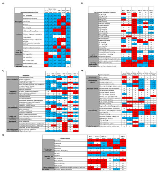 Gene-term Enrichment Pathways analysis. Tables show pathways related to genetic information processing (A), environmental information process (B), metabolism (C), organismal systems (D), and cellular processes (E) for SHAM vs. BA, DEB1 and DEB2; BA vs. DEB1 and DEB2; and DEB1 vs. DEB2. The MES value, which represents the level of a pathway, is showed for each comparison. A positive MES value (red squares) indicates higher gene enrichment (up-regulation), whereas a negative MES value (blue squares) indicates lower gene enrichment (down-regulation) for each pathway.