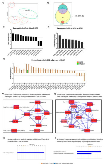 Two-dimensional t-SNEi projection of all initial LV samples, including samples from animals with aorta constriction for nine weeks (Table S1) (A). Venn diagram with exclusively and common miRs between BA, DEB1, and DEB2 when compared to SHAM (B). Log2FC for miRs found dysregulated in BA vs. SHAM (C), in DEB1 vs. DEB2 (D), and DEB1 and DEB2 subgroups vs. SHAM (E). The cut-off for differentially expressed miRs was set for a false discovery rate (FDR) ≤ 0.05 and |Log2FC| ≥ 1. Integrative mRNA/miR expression profiling shows the overlapping of the ten most enriched canonical pathways found in DEB1 compared to SHAM (F) and DEB2 (G). Since the primary biological role of miR is mRNA translation inhibition or degradation, the data set was filtered to show only relationships with miR up-regulated (Log2FC ≥ 1) and mRNA downregulated (Log2FC ≤ −0.5). The network of overlapping canonical pathways shows each pathway as a single “node” colored proportionally to the Fisher’s Exact Test p-value, where brighter red is equal to more significant. A line connects any two pathways when at least one data set is shared between them. Activation Z-score analysis results are showed for each comparison (H,I). Ingenuity pathway analysis software allowed to combine data set from miR and mRNA seq, aiming to discover a potential relationship between these two biological molecules and their role in reverse cardiac remodelling.