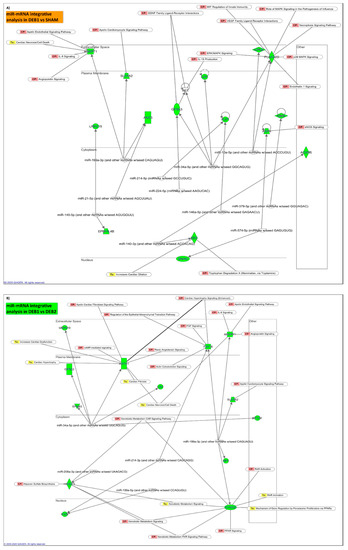 Integrative analysis connections between top down-regulated mRNA (in green) and the top-upregulated miRs in DEB1 when compared with SHAM (A) and with DEB2 (B). The molecules are distributed accordingly to their subcellular location. Analysis performed using Ingenuity pathway analysis software, Qiagen. CP, Canonical Pathway; Tx, Ingenuity Toxic List.