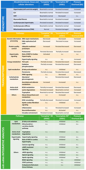 To the best of our knowledge, this is the first study performing an integrated global mRNA and miR expression profile in mice subjected to reversible banding, revealing novel miR-mRNA networks and new therapeutic targets in the field of cardiac RR. Our results evidence that cardiac remodelling’s phenotype immediately before afterload relief determines the subsequent cardiac RR’s extent. On the one hand, a “complete” cardiac RR presents LV hypertrophy regression, normal diastolic function, fibrosis and cardiomyocytes stiffness, and persistence of cardiomyocytes hypertrophy. On the other hand, an “incomplete” cardiac RR, in which hypertrophy, fibrosis, and diastolic dysfunction persist, while cardiomyocytes become more compliant with increased mitochondria disarrangement. Importantly, we highlight which genes, miRs, and biological pathways are more associated with the two different RR phenotypes. The “complete” RR group of animals was associated with an up-regulation/activation of NFAT signalling, circadian entrainment, and ubiquitin-mediated proteolysis. In contrast, “incomplete” RR presented a potent down-regulation/inhibition of fatty acids oxidation, TCA, oxidative phosphorylation, and apelin-related pathway. Moreover, ECM remodelling, inflammation, and neuroinflammatory pathways were upregulated/activated in this group.