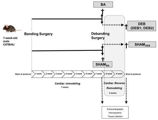 Study design. Seven-week-old C57Bl/6J mice were subjected to ascending aorta constriction (BA group) or a loose suture around the aorta (SHAMBA). After seven weeks, a second surgery was performed in half of BA and SHAM animals to remove the ascending aorta constriction or loose suture (debanding surgery). After two weeks of reverse remodelling, echocardiography and hemodynamic evaluation were performed, followed by animal termination (DEB and SHAMDEB groups). Echocardiographic assessment of the DEB group unveiled the existence of two DEB subgroups with distinct degrees of cardiac dysfunction, namely increased LV mass and severe diastolic dysfunction (DEB1 subgroup) and a second group with increased LV mass but normal diastolic dysfunction (DEB2 subgroup).