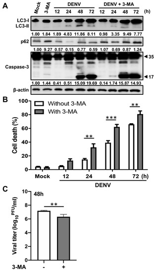 To determine the relationships among autophagy, apoptosis and DENV replication, the A549 cells were infected with DENV in the presence or absence of the autophagy inhibitor, 3-methyladenine (3-MA), for 12 to 72 h. At each timepoint, cells were harvested from 3 concomitant infections, and expressions of the following were determined by Western blot: LC3-II as a surrogate for autophagosome accumulation; p62 as a surrogate for ubiquitinated protein sequestration; and caspase-3 as a marker of apoptosis. Time-course analysis revealed LC3-II accumulation and p62 degradation in the early stages (12–24 h post-infection), but an increase in cleaved caspase-3, an indication of apoptosis, was observed at 48 h post-infection (Figure 1A). Next, we measured cell death by propidium iodide uptake assay and determined viral titers by plaque assay. The increased level of cleaved caspase-3 was associated with elevation of cell death rates (Figure 1B). These data indicated that DENV induces autophagy before apoptosis during infection. While autophagy was inhibited by 3-MA, cleaved caspase-3 was detected as early as 24 h post-infection (Figure 1A). Furthermore, cell death rates were increased within 24 to 72 h post-infection (24 h post-infection: 14.77 ± 2.56% versus 32.47 ± 8.82%, about 2.20-fold change, p < 0.01; 48 h post-infection: 39.17 ± 5.20% versus 62.17 ± 6.31%, about 1.59-fold change, p < 0.001; 72 h post-infection: 66.07 ± 1.27% versus 80.87 ± 7.96%, about 1.22-fold change, p < 0.01), whereas viral titers were decreased by 1.34 logs (p < 0.01) at 48 h post-infection in the presence of 3-MA (Figure 1B,C). These results suggest that DENV induces autophagy to inhibit early cell apoptosis and help DENV replication. However, in the late stage of DENV infection, apoptosis activities are elevated to suppress autophagy and hence triggering severe cell death. These findings suggest that there is crosstalk between autophagy and apoptosis during the DENV replication cycle.