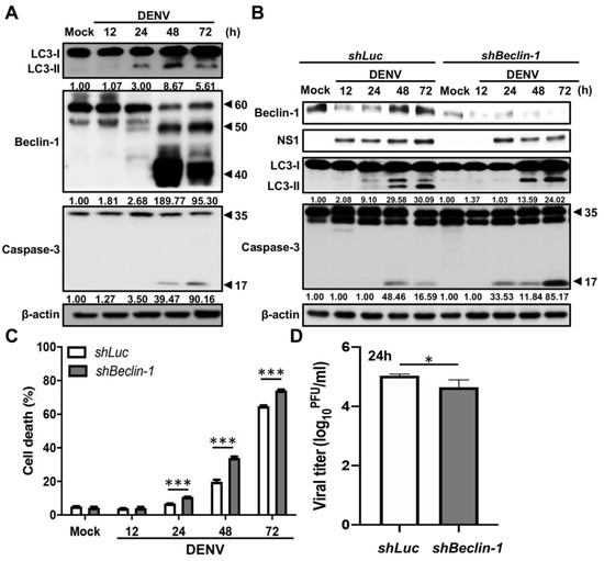 Figure 2. Beclin-1 ablation promotes cell death and inhibits virus production in DENV-infected cells. (A) A549 cells were infected with DENV at MOI = 2 for the indicated time. Western blot analysis shows representative images of LC3-I and LC3-II levels, Beclin-1 levels (full-length: 60 kDa, cleaved form: around 50 and 40 kDa), as well as procaspase-3 (35 kDa) and cleaved caspase-3 (17 kDa) levels in mock and DENV-infected cells. β-actin is shown for loading control. The blots were quantified by using β-actin as a calibrated control. The relative ratios (numbers below the blots) of LC3-II, cleaved Beclin-1 (40 kDa) or cleaved caspase-3 to mock were indicated. (B) shLuc and shBeclin-1 A549 cells were infected with DENV at MOI = 2 for indicated time. The expression of Beclin-1, NS1, LC3 and caspase-3 was analyzed by Western blotting. β-actin is shown for loading control. The blots were quantified by using β-actin as a calibrated control. The relative ratios (numbers below the blots) of LC3-II or cleaved caspase-3 to mock were indicated. (C) The percentage of cell death was determined by propidium iodide staining. Results shown are means ± SD for triplicate cultures. Statistical significance was based on two-way ANOVA followed by Bonferroni’s multiple comparison test. (D) The viral titers were determined by plaque assay. Results shown are means ± SD for triplicate cultures. Statistical analysis was performed using a two-tailed Student t-test. All the data are representative of independent experiments. * p < 0.05, and *** p < 0.001.