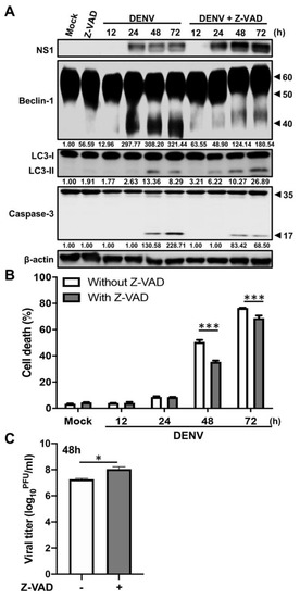 Figure 3. Caspases mediate cleavage of Beclin-1 in the DENV-infected cells. A549 cells were pretreated with or without 25 μM Z-VAD and then infected with DENV at MOI = 2 for the indicated time. (A) Western blot analysis showing representative images of NS1 levels, Beclin-1 levels (full-length: 60 kDa, cleaved form: around 50 and 40 kDa), LC3-II accumulation, as well as procaspase-3 (35 kDa) and cleaved caspase-3 (17 kDa) levels in A549 cells. β-actin is shown for loading control. The blots were quantified by using β-actin as a calibrated control. The relative ratios (numbers below the blots) of LC3-II, cleaved Beclin-1 (40 kDa) or cleaved caspase-3 to the mock were indicated. (B) The percentage of cell death was determined by propidium iodide staining. Results shown are means ± SD for triplicate cultures. Statistical significance was based on two-way ANOVA followed by Bonferroni’s multiple comparison test. (C) The viral titers were determined by plaque assay. Results shown are means ± SD for triplicate cultures. Statistical analysis was performed using a two-tailed Student t-test. All the data are representative of independent experiments. * p < 0.05, and *** p < 0.001.