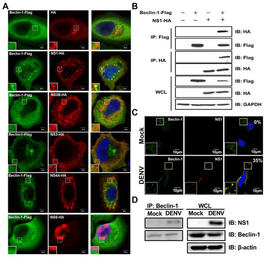 Figure 4. The colocalization and interaction of DENV NS1 with Beclin-1 are found in NS1-expressing and DENV-infected cells. (A) Hela cells were co-transfected with NS plasmids (including HA, NS1-HA, NS2B-HA, NS3-HA, NS4A-HA or NS5-HA) and Belcin-1-Flag plasmids for 48 h. At 48 h post-transfection, cells were fixed, permeabilized, and stained with anti-HA Abs (green), anti-Flag Abs (red) and DAPI (blue). Cells were mounted and observed by confocal microscopy. The square insets show higher magnification. Scale bar: 5 μm. (B) Hela cells were co-transfected with NS1-HA and Belcin-1-Flag plasmids for 48 h. Cells were lysed and the cell lysates were immunoprecipitated by anti-Flag Abs followed by immunoblotting using anti-HA and anti-Flag Abs. The whole cell lysate (WCL) was used as the protein control. (C) A549 cells were infected with DENV at MOI = 2 for 24 h. At 24 h post-infection, cells were fixed, permeabilized, and stained with anti-NS1 Abs (green), anti-Beclin-1 Abs (red) and DAPI (blue). Cells were mounted and observed by confocal microscopy. The square insets show higher magnification. Percentages of colocalized dots of NS1-Beclin-1 complex were indicated in the upper right corner. Scale bar: 10 μm. (D) Cells were lysed and the cell lysates were immunoprecipitated by anti-Beclin-1 Abs followed by immunoblotting using anti-NS1 and anti-Beclin-1 Abs. The whole cell lysate (WCL) was used as the protein control.