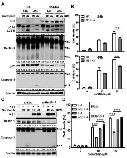 To further verify the possible roles of Beclin-1 involvement in the anti-apoptotic effect of NS1, the shBeclin-1 and shLuc cells were transfected with NS1-containing plasmids and treated with sorafenib. Results showed that expression of NS1 reduced sorafenib-induced cleavage of caspase-3 (Figure 5C) and cell death (Figure 5D) (10 mM sorafenib treatment: 48.17 ± 0.45% versus 24.12 ± 0.02%, about 0.50-fold change, p < 0.001; 20 mM sorafenib treatment: 69.17 ± 3.02% versus 36.16± 1.18%, about 0.52-fold change, p < 0.001) in shLuc cells. In contrast to control shLuc cells, this phenomenon did not occur in Beclin-1 knockdown cells (Figure 5C,D) (10 mM sorafenib treatment: 43.93 ± 1.25% versus 54.19 ± 8.38%, about 1.23-fold change, p < 0.01; 20 mM sorafenib treatment: 65.47 ± 1.96% versus 70.67± 1.15%, about 1.08-fold change, p = 0.17). To conclude, our data suggest that NS1, but not NS3, promotes autophagy by attenuating Beclin-1 degradation.