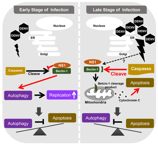 In this study, we explored the crosstalk between DENV-induced autophagy and apoptosis. We revealed that DENV-induced autophagy prevents early cell apoptosis and facilities viral replication. DENV NS1 was found to protect Beclin-1 from caspase-mediated cleavage to maintain the autophagy function. However, elevated apoptotic activities suppress autophagy by inducing fragmentation of Beclin-1, which leads to cell apoptosis in the late stages of DENV infection.