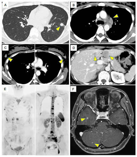 Key imaging results at diagnosis. (A). Chest computed tomography (CT) shows a primary lung tumor in the left lower lung. (B). Contrast-enhanced CT shows enlarged mediastinal lymph nodes (LNs). (C). Contrast-enhanced CT shows enlarged bilateral breast tumors. (D). Contrast-enhanced CT shows metastatic liver tumors. (E). Diffusion-weighted imaging of whole-body magnetic resonance imaging at the diagnosis shows multiple abnormal signals in the rib, pelvis and vertebral bodies, indicating multiple bone metastasis. Left panel also shows abnormal signals in bilateral breast tumors. (F). Contrast-enhanced brain MRI shows metastatic brain tumors. Arrowheads indicate metastatic tumors.
