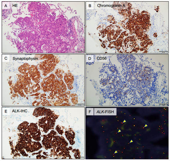 - Zheng, Q.; Zheng, M.; Jin, Y.; Shen, X.; Shan, L.; Shen, L.; Sun, Y.; Chen, H.; Li, Y. ALK-rearrangement neuroendocrine carcinoma of the lung: A comprehensive study of a rare case series and review of literature. Onco Targets Ther. 2018, 11, 4991–4998. [Google Scholar] [CrossRef] [PubMed]