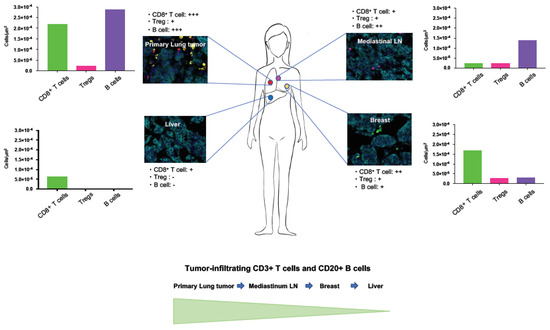 Understanding inter-site heterogeneity of the TIME is an urgent challenge in the development of treatment modalities to overcome intra-patient tumor heterogeneity and improve patients’ survival. However, inter-site heterogeneity of the TIME in LCNEC with ALK rearrangement remains to be uncovered. We investigated the immune contexture of pretreatment primary and metastatic tumors including mediastinal lymph node (LN), liver, right and left breast tumors by fluorescent multiplex immunohistochemistry. The fluorescent multiplex immunohistochemistry analysis has been shown to capture multidimensional data related to tissue architecture, spatial distribution of multiple cell phenotypes, and co-expression of signaling [21,22]. High-speed scanning of whole slide images was performed on stained tissue sections. Pan-cytokeratin of tumor cells and PD-L1 were simultaneously stained to evaluate the complex relationship among tissue architecture, spatial distribution of immune cells and expression of PD-L1, and then the tissue localizations of TIL were evaluated. CD3+ T cells (which include both CD4+ T cells and CD8+ T cells), CD8+ T cells, immunosuppressive CD3+FOXP3+ regulatory T cells (Tregs), and CD20+ B cells in the tumor nest and surrounding stroma were profiled and quantified by an automated quantitative pathology imaging system (Figure 3).