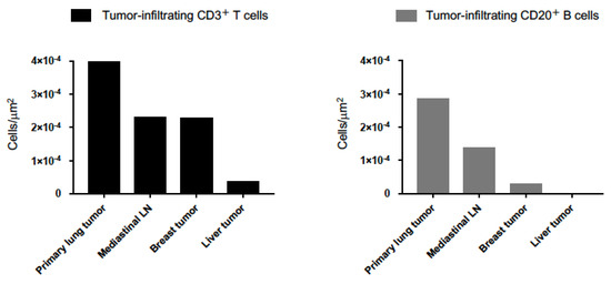 Interestingly, CD3+ T cell and CD20+ B cell infiltrations in tumors were decreased with the distance from primary lung lesion (Figure 4 and Figure 5).