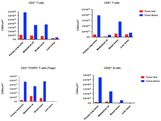 It has been shown that the distribution and ability of lymphocytes to localize within tumor islets influence the outcome of tumor development and the responsiveness to cancer immunotherapy [23,24]. Thus, we further investigated the detail of tissue localizations of TIL subpopulations; CD3+ T cells, CD8+ T cells, Tregs, and CD20+ B cells in the tumor cell nest and surrounding stroma and quantified them by using automated quantitative pathology imaging system in primary and metastatic tumors. Although tumor PD-L1 expression was not detected in both primary pulmonary and metastatic LCNEC with ALK rearrangement, primary lung tumors had highest amount of CD3+ T cell, CD8+ T cell and CD20+ B cell infiltrations (Figure 4, Figure 5 and Figure 6). Higher CD8+ T cell infiltrations were detected in primary lung and breast tumors compared to mediastinal LN and liver tumors, however, which were mostly restrained in the stroma of tumors (Figure 4 and Figure 6). Treg infiltrations were observed in primary lung, mediastinal LN and breast tumors, but not detected in metastatic liver tumors (Figure 6). Higher Treg infiltrations into tumor nests were detected in mediastinal LN and breast tumors compared to primary lung tumors (Figure 6). Higher CD20+ B cell infiltrations were detected in primary lung and mediastinal LN tumors compared to breast and liver tumors, however, which were mostly restrained in the stroma of tumors (Figure 6). Only a few intratumoral CD3+ T cell, CD8+ T cell, Treg, and CD20+ B cell infiltrations were observed in metastatic liver tumors (Figure 6).