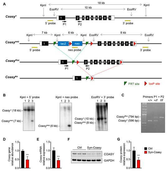 The Coasy targeting vector, obtained from the European Mutant Mouse Consortium (EUCOMM) (ETPG00282_Y_2_E03), includes a lacZ/neo cassette with the β-galactosidase (lacZ) reporter and the neomycin (neo) resistance gene under the control of mouse En2 and human β-actin promoter, respectively (