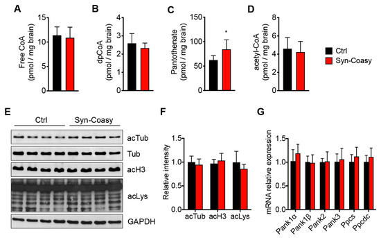 Strangely enough, despite no other pathway being currently known for de novo CoA synthesis, and COASY being considered a crucial enzyme in both mice and humans, we found normal CoA, dpCoA, acetyl-CoA, and protein acetylation levels in the brain of Syn-Coasy animals. Contrariwise, a significant increase of pantothenic acid was detected, suggesting that the enzymatic block due to Coasy ablation could cause an upstream accumulation of CoA precursors up to pantothenate. It is also possible that the intermediate 4′-phosphopantetheine, which cannot be converted into dpCoA, is diverted into pantothenate, thus triggering a vicious circle leading to pantothenate accumulation. Why did we not observe CoA deficiency in this model? The rationale behind this phenomenon is not known at the moment, but we can hypothesize a couple of possible explanations. First, we specifically ablated